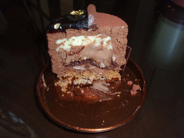Triple Chocolate Cake mit weißer, Milch- u. dunkler Schokolade, Blattgold usw.