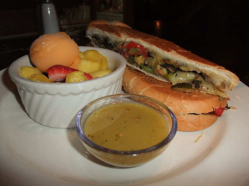 Sun-drenched Portobello & Vegetable Sandwich with Fruitsalad + Mango-Sorbet
